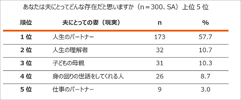 また、夫にとってどんな存在が理想か聞いたところ、同じく1位は「人生のパートナー」(63.3%)で、現実と理想には5.6ポイントの差があった。