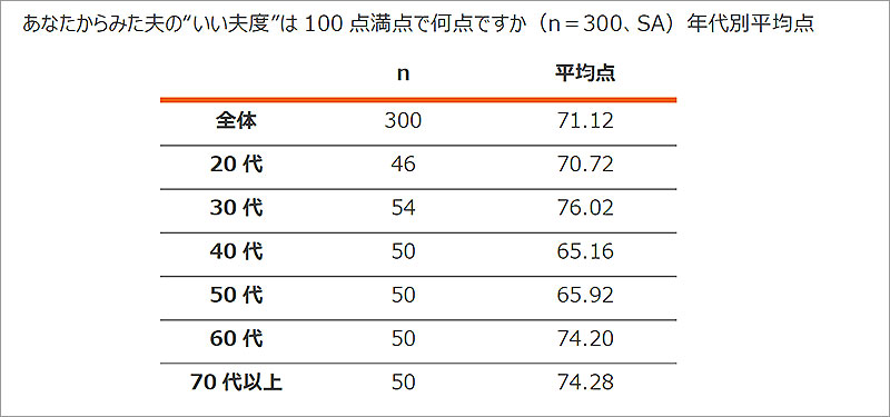 経営者の妻300名に、夫の“いい夫度”を100点満点で聞いたところ、平均71.12点と高評価。