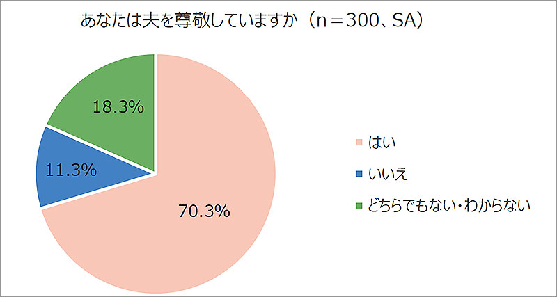 また、夫を尊敬しているか聞いたところ、「はい」と回答したのは70.3%。
