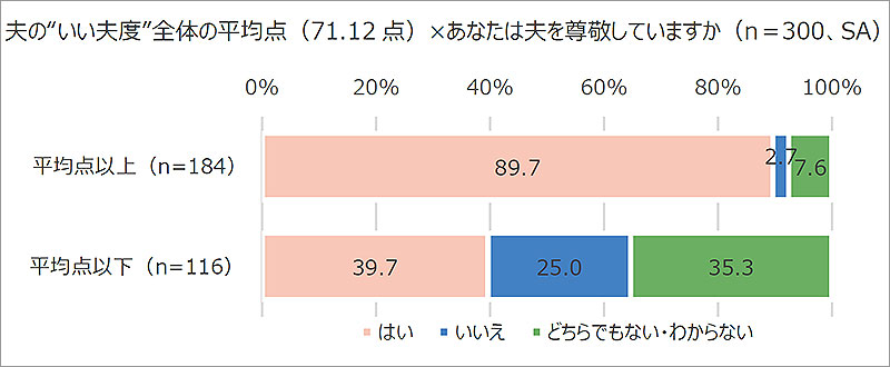 さらに、夫の“いい夫度”で全体の平均点(71.12点)以上の点をつけた経営者の妻の89.7%が、夫を尊敬しているということもわかった。
