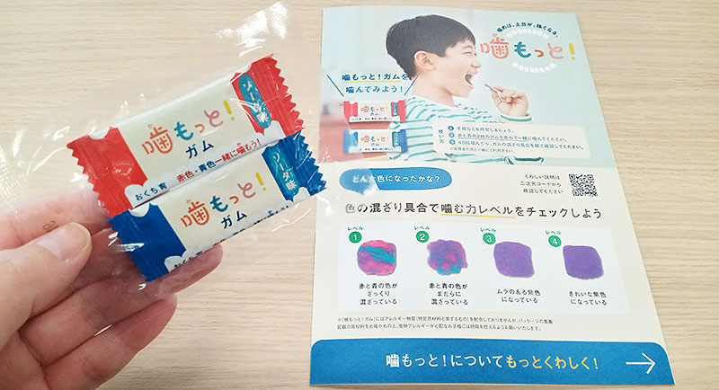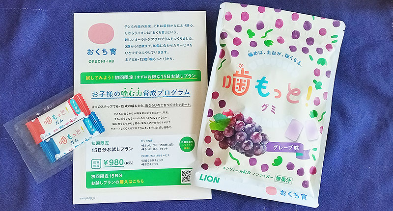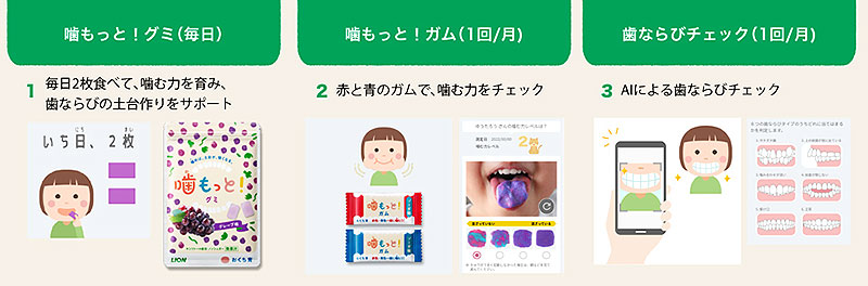 ライオンは、「歯ならびの土台づくり」が重要な、歯の生え変わり期の子ども 6~12歳 向けに、『噛もっと!グミ』(毎日)で噛む力を育み、『噛もっと!ガム』(月1回)で噛む力を チェックし、『おくち育会員サイト』で歯ならびチェックができるセット『おくち育 噛もっと!』を発売中。