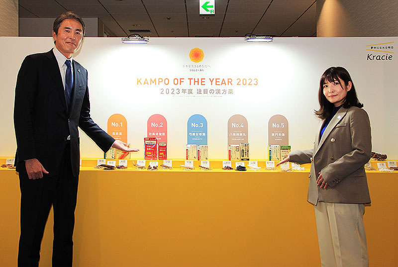 クラシエ薬品は、漢方薬市場の動向や、2023年に売上を伸ばした「注目の漢方薬」などをまとめた「KAMPO OF THE YEAR 2023」を発表。クラシエ薬品 草柳徹哉 代表取締役社長と、クラシエ 薬品カンパニー ヘルスケア事業部 マーケティング部 砂橋久瑠実 課長が、その最注目トピックス話題を公表した。