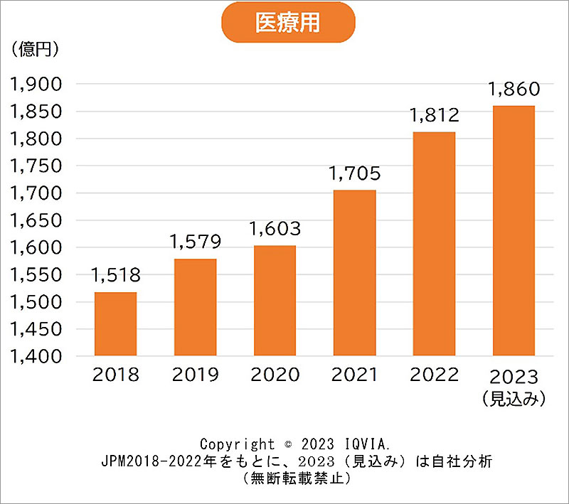 また、医療用漢方薬市場も直近6箇年で継続的に成長。2023年度は前年比103%を見込んでいます」