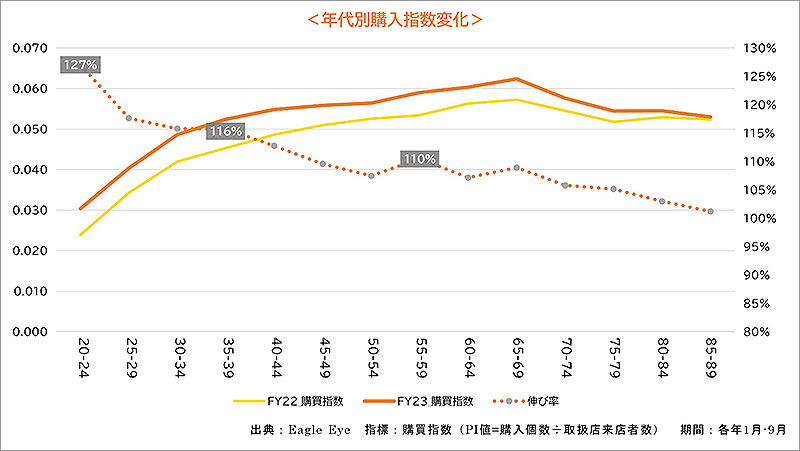 購入個数と来店者数を基に算出した購買指数(PI値)を年代ごとに比較を示したグラフでは、20代・30代ではいずれも前年比110%以上の高い伸長率となりました。
