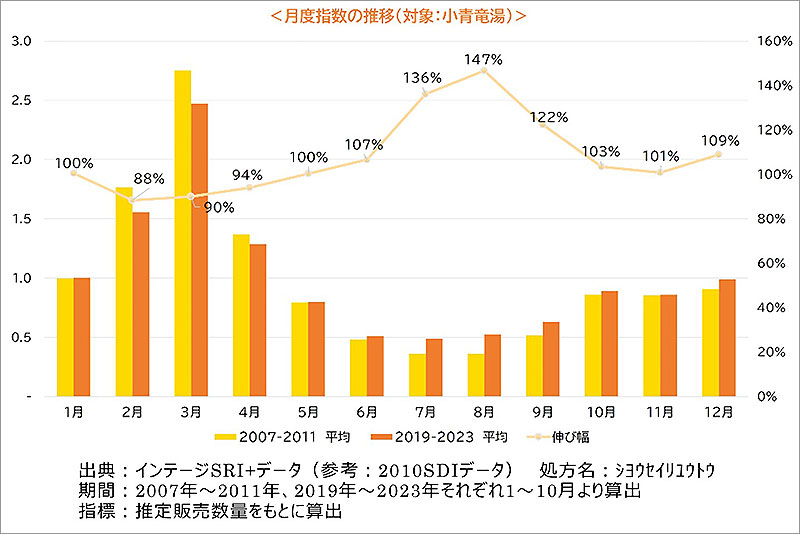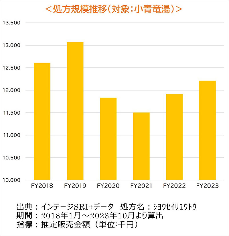 一般的に「鼻炎」に使われる漢方薬『小青竜湯』の需要は、2019年から2022年にかけて大きく縮小しましたが、2023年は需要が再拡大しています。