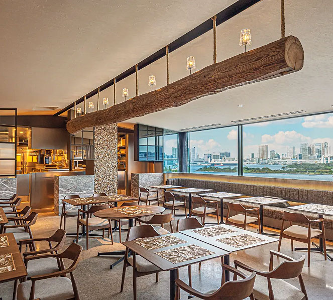 ここは厳選食材と妥協なき独自メニューで一期一会の味わいが体感できる、ノスタルジックな美食空間と、お台場の絶景が調和する非日常空間。