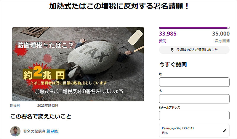 ―――「加熱式たばこの増税に反対する署名請願!」は、現在も賛同署名者を募っているから、詳しくは公式サイトをチェック↓↓↓