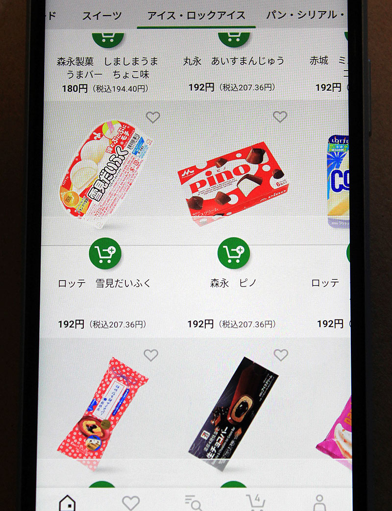 カテゴリからでもいいし、ラインナップ全体からでも、ポチッとサクサク選んでいく。アイスも注文できる!