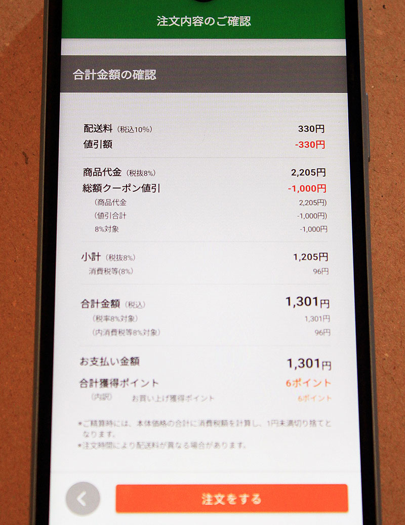 この買い物かごを最終チェックして、ポチッと押して注文確定。