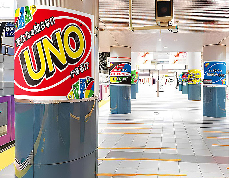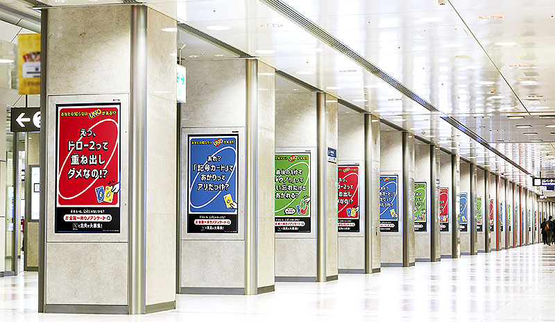 さらに、「#全国一斉ウノアンケート」を盛り上げ、より多くの回答を集めるべく、1月11日のウノの日に合わせて、京王井の頭線渋谷駅、大阪・京都・三ノ宮・新大阪駅、JR名古屋駅に駅広告が出現。