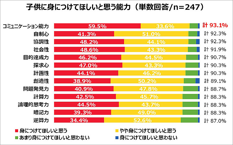 子どもがいる247名に、子どもに身につけてほしい能力を聞くと「コミュニケーション能力」と93.1%が回答し、1位となりました。ついで「自制心」「協調性」「社会性」と続く結果となりました。