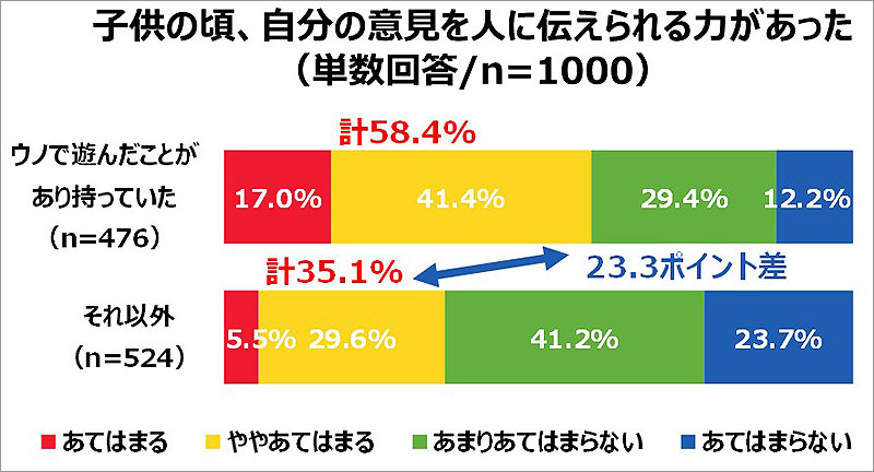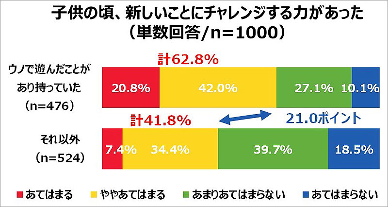 さらに、子どものころウノで遊んだことがあり、持っていた人は、[自分の意見を人に伝えられる力があった][新しいことにチャレンジする力があった]と言う項目でも大きな差となっています。