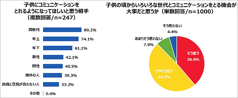 また、子どもの有無にかかわらず、子どものころからいろいろな世代の方とコミュニケーションをとる機会が大事だと思うと計87.7%が回答。「多世代交流力」が必要となってきていることが調査から判明しました。