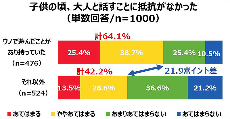 子どものころウノで遊んだことがあり、持っていた人の傾向を見ると、[大人と話すことに抵抗がなかった]と64.1%が回答。