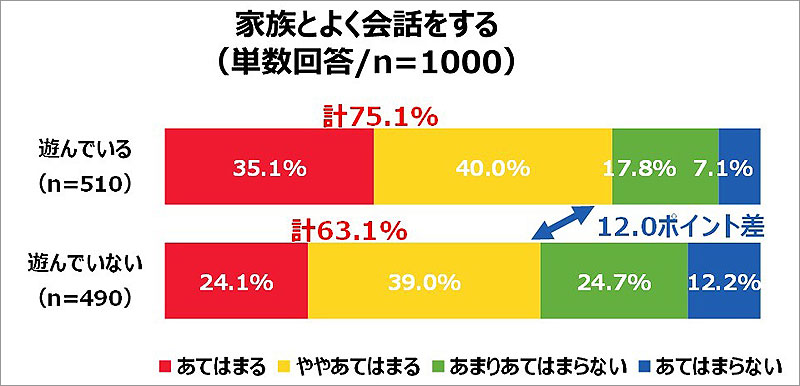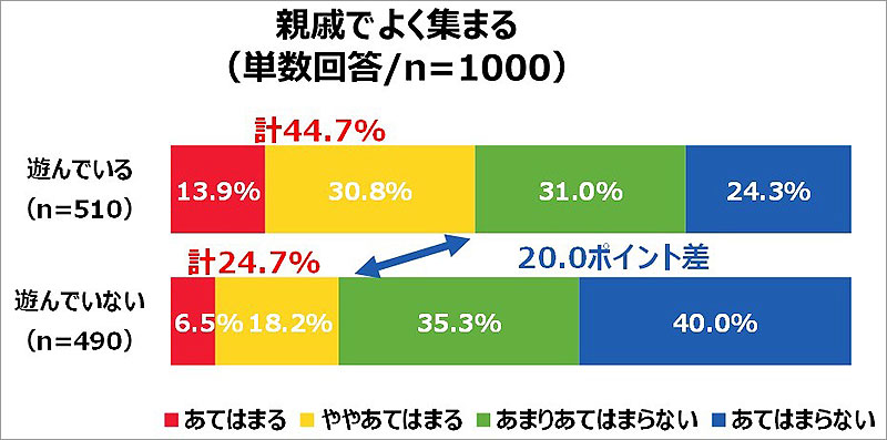 また、ウノで大人になってからも遊んだ経験がある人は家族とよく会話をし、親戚でよく集まる傾向にあることがわかりました。