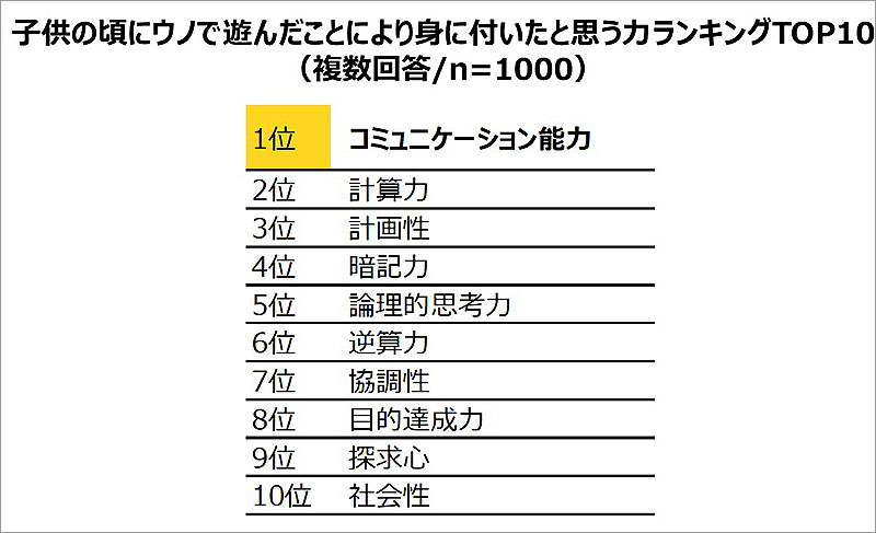 子どものころにウノで遊んだことで身に付いたと思う能力第1位は「コミュニケーション能力」!