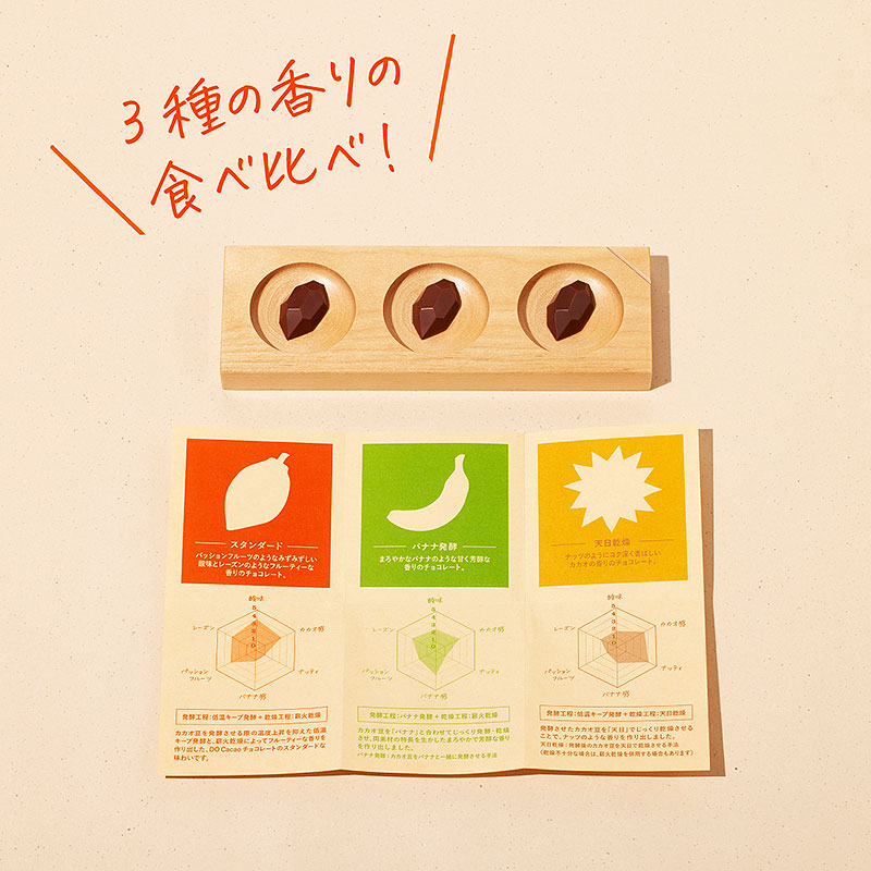この「DO Cacao chocolate」は、カカオ豆の発酵・乾燥方法によって変わる香りを体験いただける3種類のチョコレート。