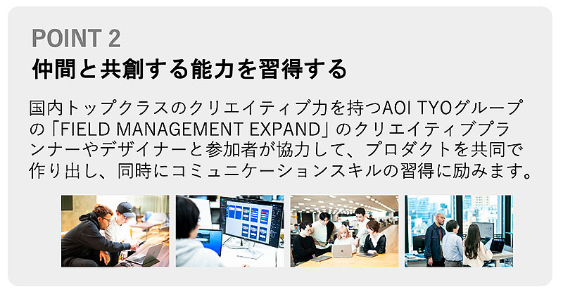 国内トップクラスのクリエイティブ力をもつ AOI TYO グループ「FIELD MANAGEMENT EXPAND」のクリエイティブプランナーやデザイナーと参加者が協力し、プロダクトを共同で制作し、同時にコミュニケーションスキルも習得していく。