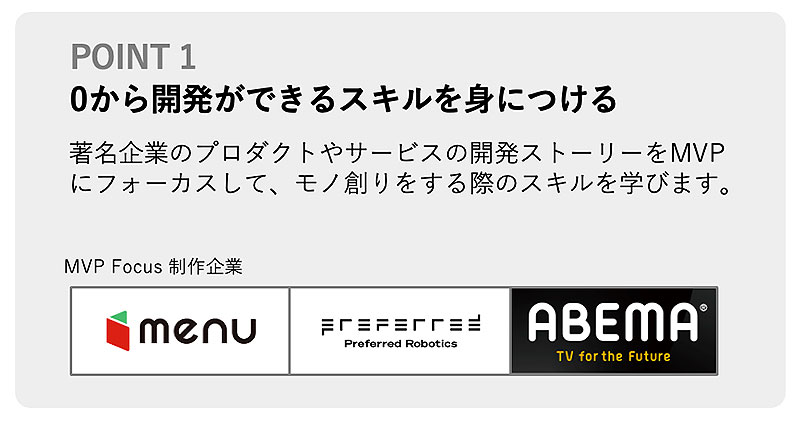 著名企業のプロダクトやサービスの開発ストーリーを MVP(Minimum Viable Product:ユーザーに必要最低限の価値を提供できるプロダクト)にフォーカスし、ものづくりスキルを学ぶ。