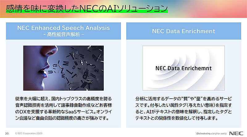 ―――これ、ぜんぶ日本電気 NEC の AI技術「NEC Enhanced Speech Analysis 高性能音声解析」や「NEC Data Enrichment」などを活用した画期的な「感情を味に変換したNECのAIソリューション」たち。