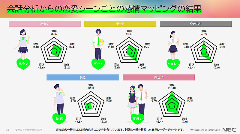 32個の感情ワードから感情スコアを付与、恋愛シーンごとに可視化