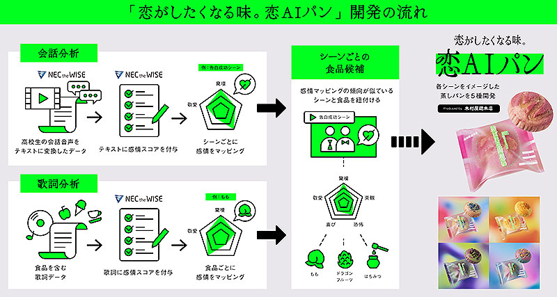 そして NEC は今回、Abema TV と 木村屋總本店 とともに、恋愛感情を“味”で表現した「恋AIパン」(れんあいぱん)を2024年2月からリリースする。