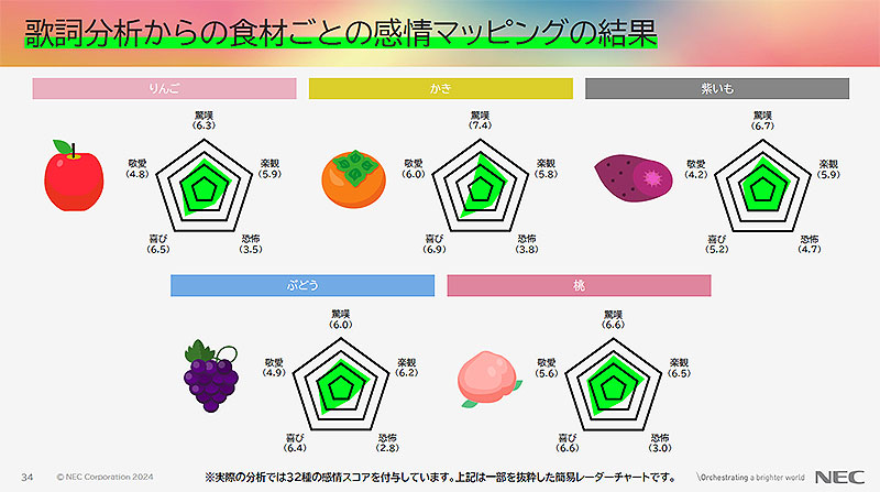 「NEC Data Enrichment」を用い、食品を含む歌詞に感情スコアを付与し、食品のイメージが持つ感情の傾向を可視化。