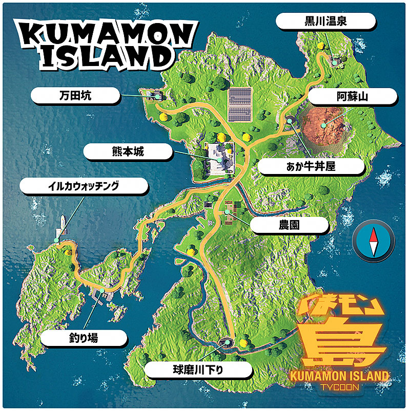 このフォートナイト FORTNITE「くまモン島」では、トマト・いちご・すいか などの熊本県を代表する特産品の収穫や、魚釣りをしてコインを稼ぎ、熊本城・黒川温泉・球磨川くだり などの代表的な観光施を建設していく。