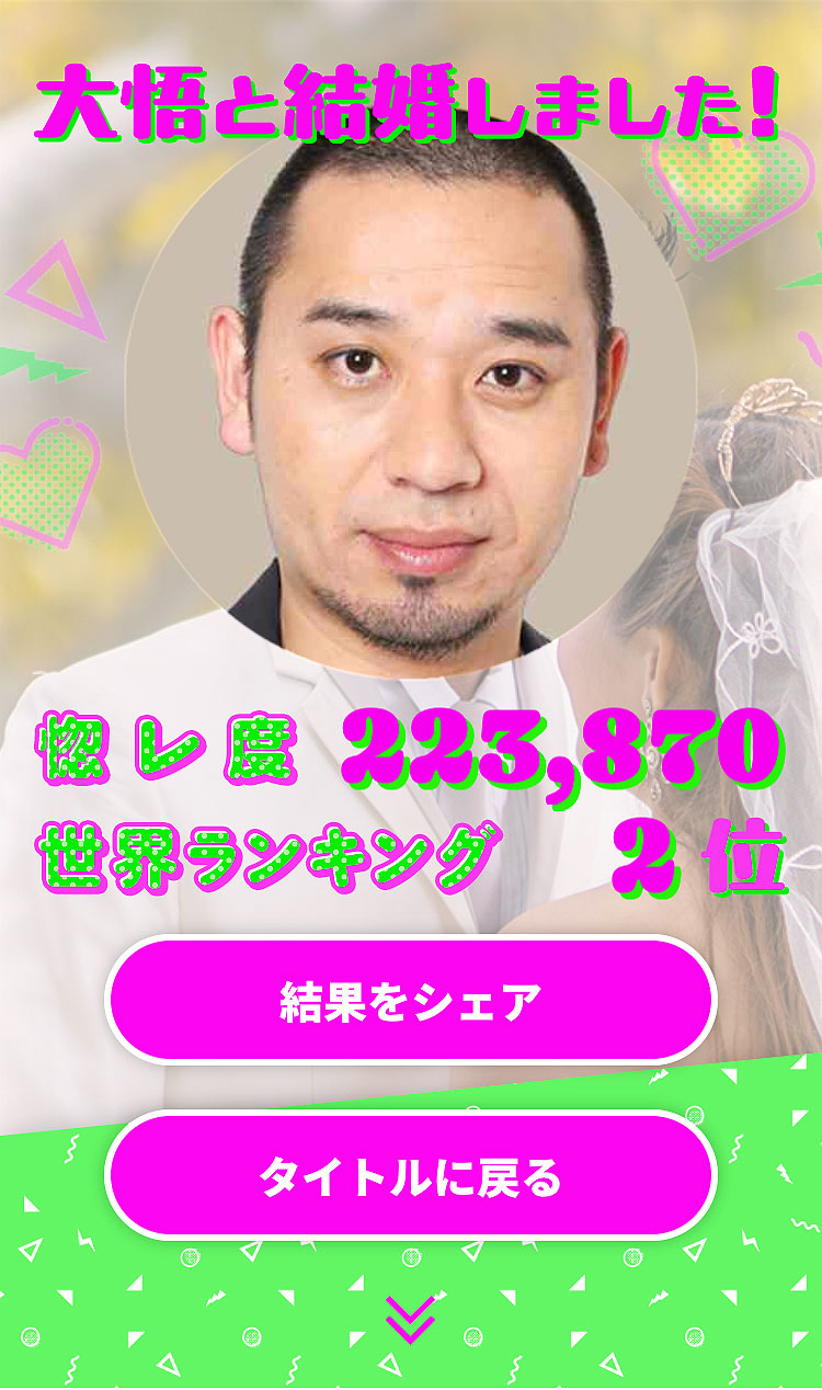 ゲーム終了時に高いスコアを獲得すると、大悟と結婚するエンディングが……!!!!