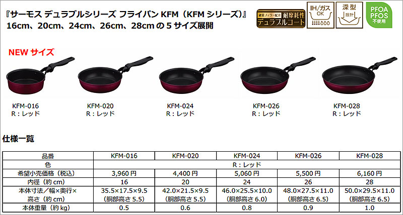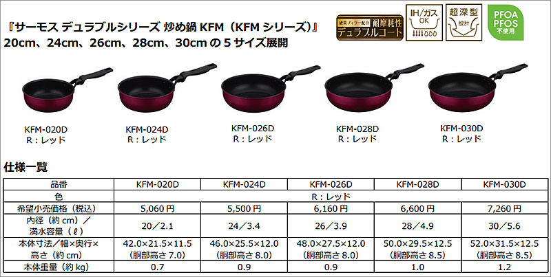 2月21日発売の最新モデル サーモス デュラブルシリーズ(KFM シリーズ)は、深型設計で IH・ガス火対応の KFH シリーズのフライパン、炒め鍋、玉子焼きフライパン。