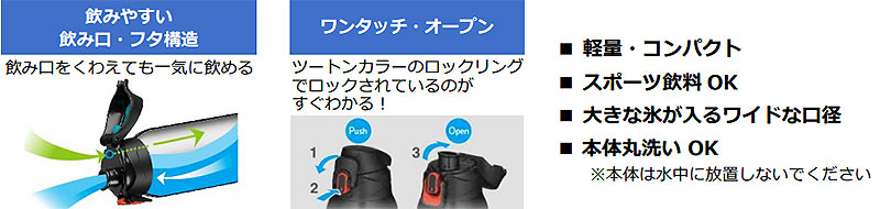 機能面では、新機構の飲み口「クイックオープン構造」を採用し、水分補給もクイックに素早くできる。