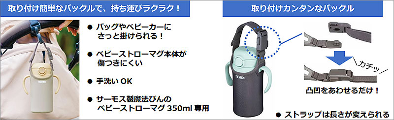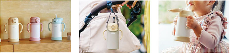 さらに、「専用のポーチがほしい」「落としたときに衝撃から守りたい」などの声に応え、バックル付きでベビーカーやバッグに取り付けられる専用ポーチ『サーモス ストローマグポーチ(APK-350)』も新発売する。