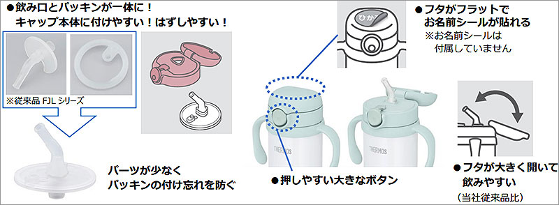 従来品の FJL シリーズに比べ、パーツ点数が少なくなり、お手入れもかんたん、パッキンの付け忘れを防いでくれるのもうれしい。また、従来品よりフタが大きく開き飲みやすくなったのも特長。