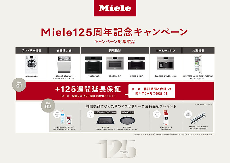 今回の「Miele125 周年記念キャンペーン 125 years of quality.」では、「2 年+125 週間」の合計約 4 年 5 か月の期間に渡って保証するというから、詳細は公式サイトをチェック↓↓↓