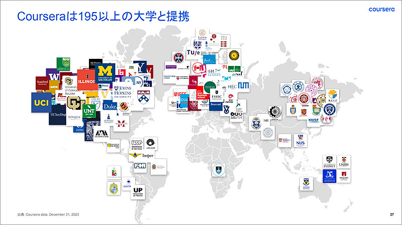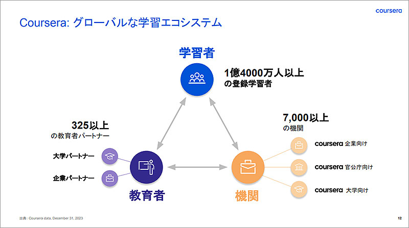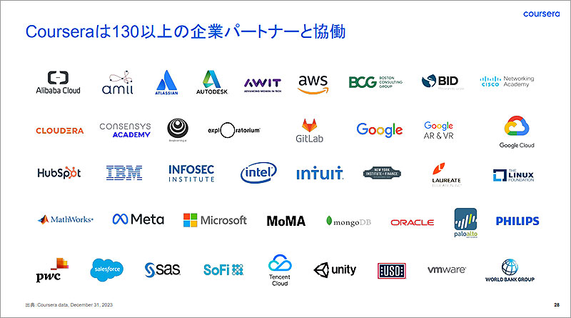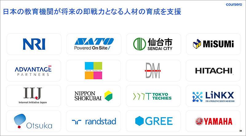 また、即戦力となる人材を育成するために、野村総合研究所、SATO グループ、仙台市を含む主要企業や政府機関は、Coursera の企業向けサービスを利用している。