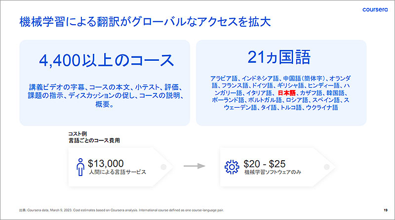 さらに今回、AI を活用した翻訳によって、東京大学が提供する「ビッグバンからダークエネルギーまで(From the Big Bang to Dark Energy)」、「ゲーム理論へようこそ(Welcome to Game Theory)」、「インタラクティブ・コンピュータグラフィックス(Interactive Computer Graphics)」、「日本の大学で学ぶ(Studying at Japanese Universities)」などの人気講座が 21 言語に翻訳され、質の高い日本のコンテンツが世界中で利用されるようになった。