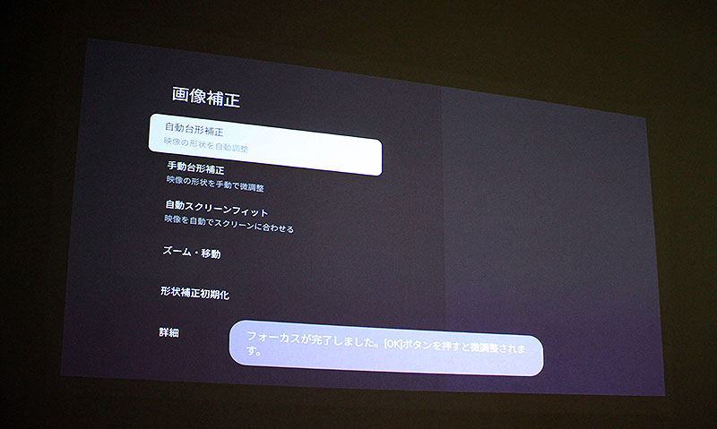 「設定」を開いて、自動台形補正をクリックするだけで、オートフォーカスと同時に、壁に斜めに映像をあてても、すぐにカチッと“真正面+角ピタ”に補正してくれる。