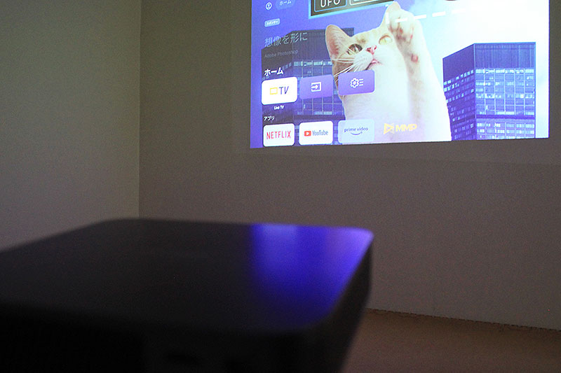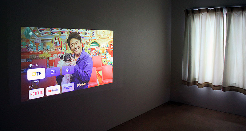 日が落ち、部屋を真っ暗にすると、Google TV 搭載スマートレーザープロジェクター「Dangbei Atom」(ダンベイ アトム)は、こんな映像が部屋の壁面に映し出される。