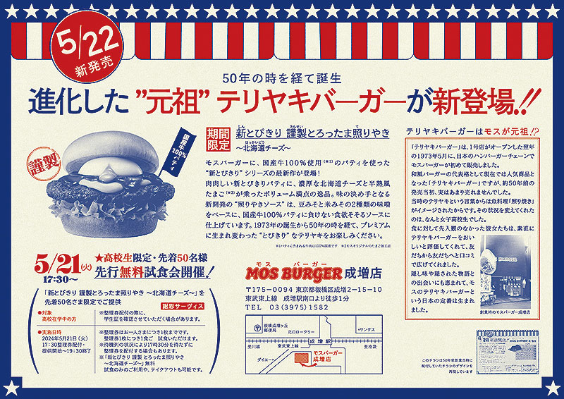 この「新とびきり 謹製とろったま照りやき~北海道チーズ~」発売前日の5月21日、モスバーガー成増店(東京都板橋区)で、高校生50名に無料先行試食会を開催!
