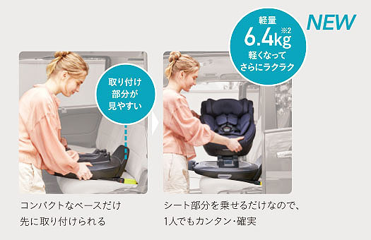 先にベースだけ取り付けられるから、取り付け位置が見えやすくかんたん。またシートは 6.4kg と軽量なため持ち運びもラクラク。