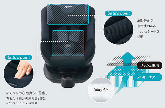 7月発売の「クルリラ エックス プラス」「クルリラ ビッテ エックス プラス アカチャンホンポ限定モデル」(ともにメーカー希望小売価格 7万2000円)は、赤ちゃんの姿勢の特徴であるぐらぐらな首をやさしく安定させることを「ナチュラクッション」(特許出願中)で実現したコンパクトベッド型チャイルドシート。