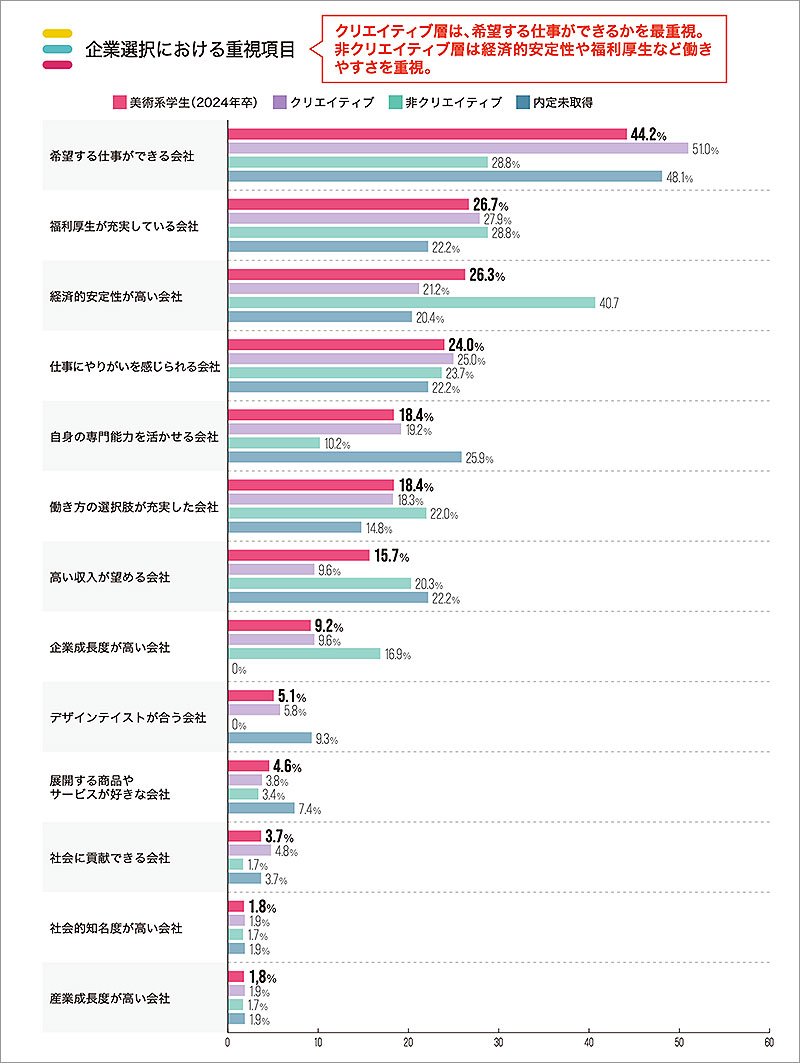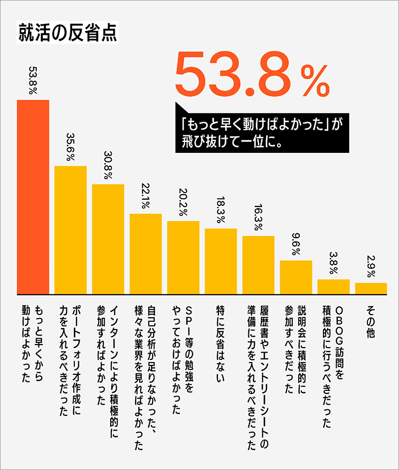 また、ユウクリの調査によると、就職活動の反省点として、クリエイティブ職では53.8%の人が「もっと早くから動けばよかった」と回答し、美術系学生がとくに就職活動に取りかかるのが遅くなっていることが判明。