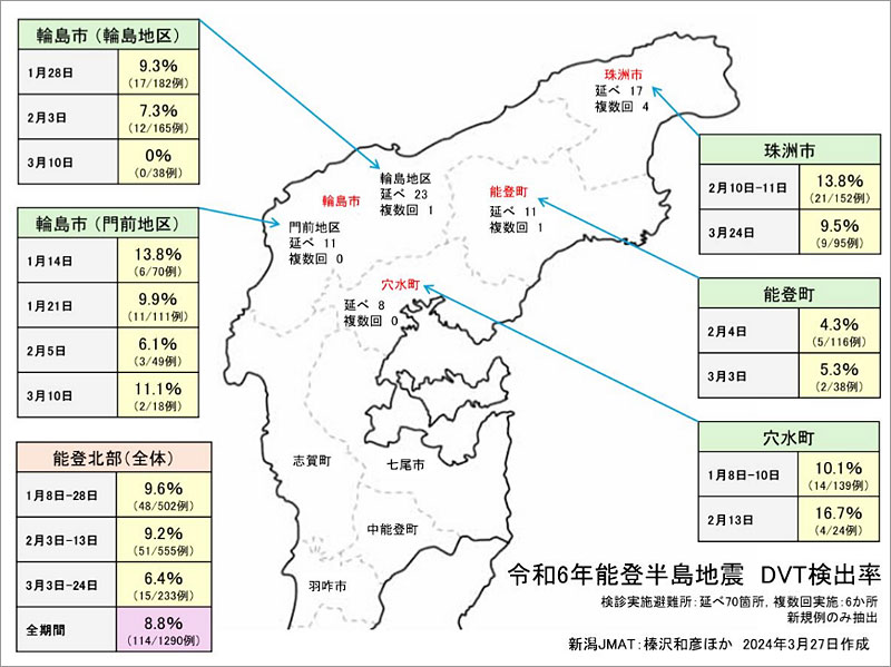 具体的には、1.5次避難所(いしかわ総合スポーツセンター内)開設に伴う人的支援者の派遣、避難所で弾性ストッキング配布・指導活動に伴う人的支援者の派遣、災害派遣福祉チームによるDVT(深部静脈血栓症)検診活動実施のための人的支援者の派遣、JMAT部隊によるDVT検診活動実施のための人的支援者の派遣など。