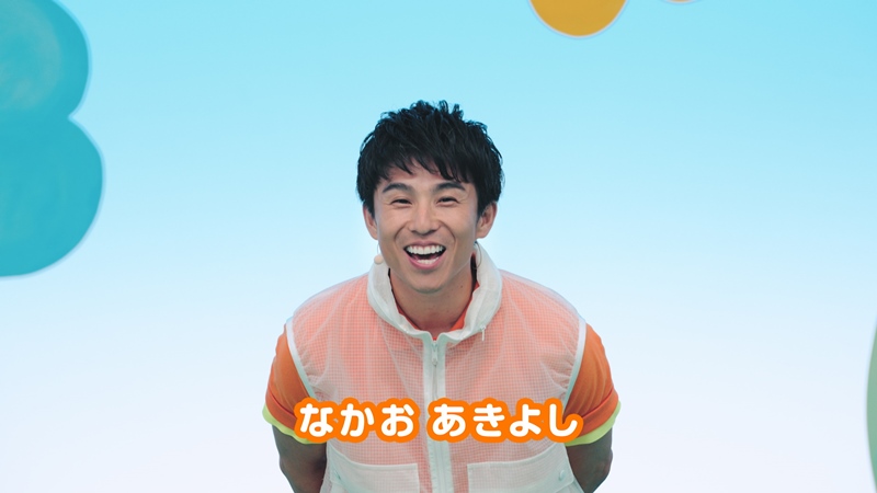 子ども番組風のスタジオに、カラフルな衣装を着た中尾明慶が登場。