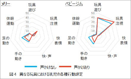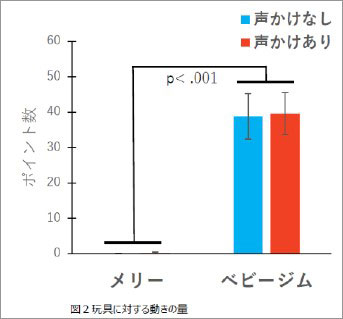 玩具をつかんだり、動かしたりする玩具に対する動きについては、乳児は声かけの有無にかかわらずベビージムの時のほうが多いことがわかった。