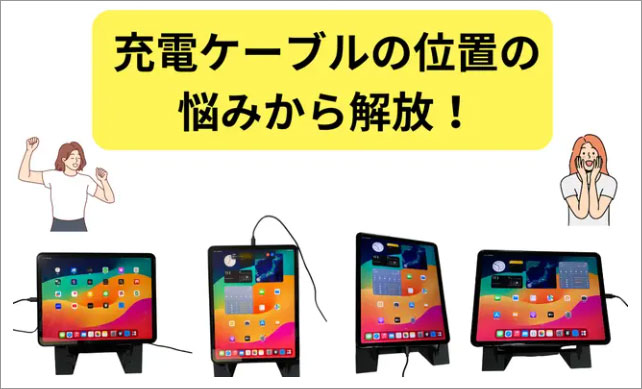 okamiPad.lite は、iPad の上下左右チャージケーブルが差し込めるから、充電しながらの縦置き利用もOK。