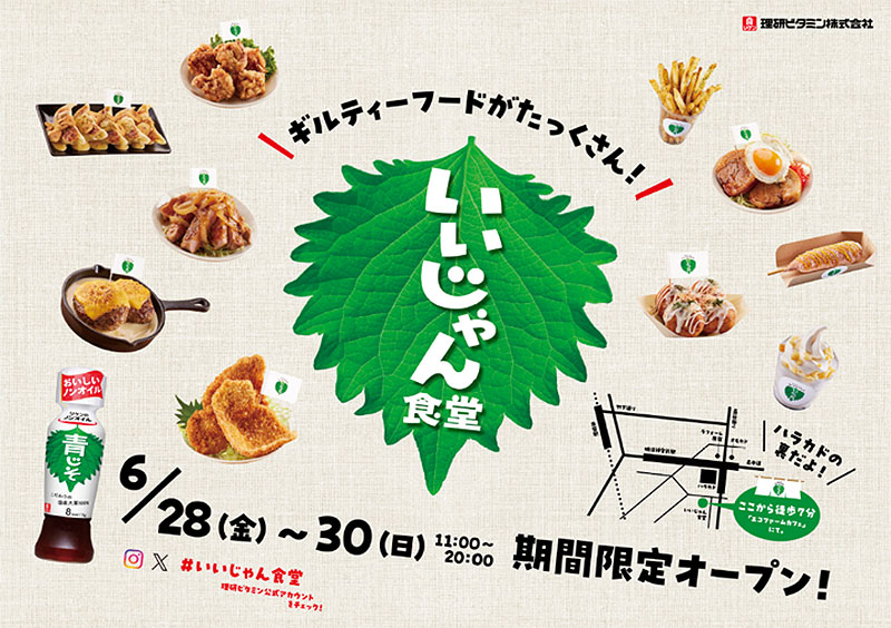 理研ビタミンは、6月28~30日の3日間、東京・原宿「エコファームカフェ632 HARAJUKU」(東京都渋谷区神宮前6丁目32−10)で、ギルティーフード11種類の新たな味わいを体験できるポップアップイベント「いいじゃん食堂」をオープン!