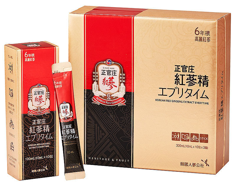 「正官庄 紅蔘精(こうじんせい)エブリタイム」は、正官庄の6年根紅参を長時間煎じた液だけを濃縮させた高純度エキスを、さらに手間なくかんたんに摂れるよう、パウチタイプに。