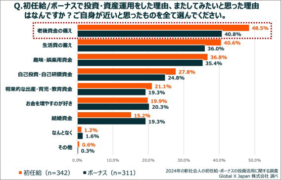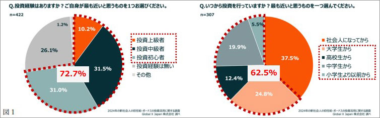 ―――日本で唯一のETF(上場投資信託)専門資産運用会社 Global X Japan は、2024年4月に新卒(大学卒・大学院卒)で就職した全国20代の新社会人男女422名を対象に、投資経験と初任給・ボーナスの活用に関して調査。