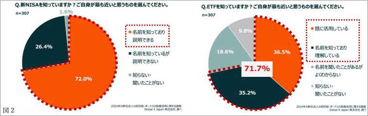 投資経験者の 72.0%が新 NISA の内容を理解。ETF も 71.7%が理解、36.5%が実際に ETF を活用していた。